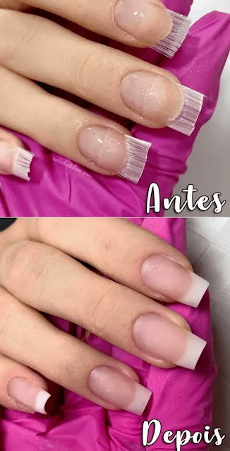 - Acabamento: é aplicada mais uma camada de gel para fortalecer as unhas e modelar a curvatura delas, para um acabamento mais natural;